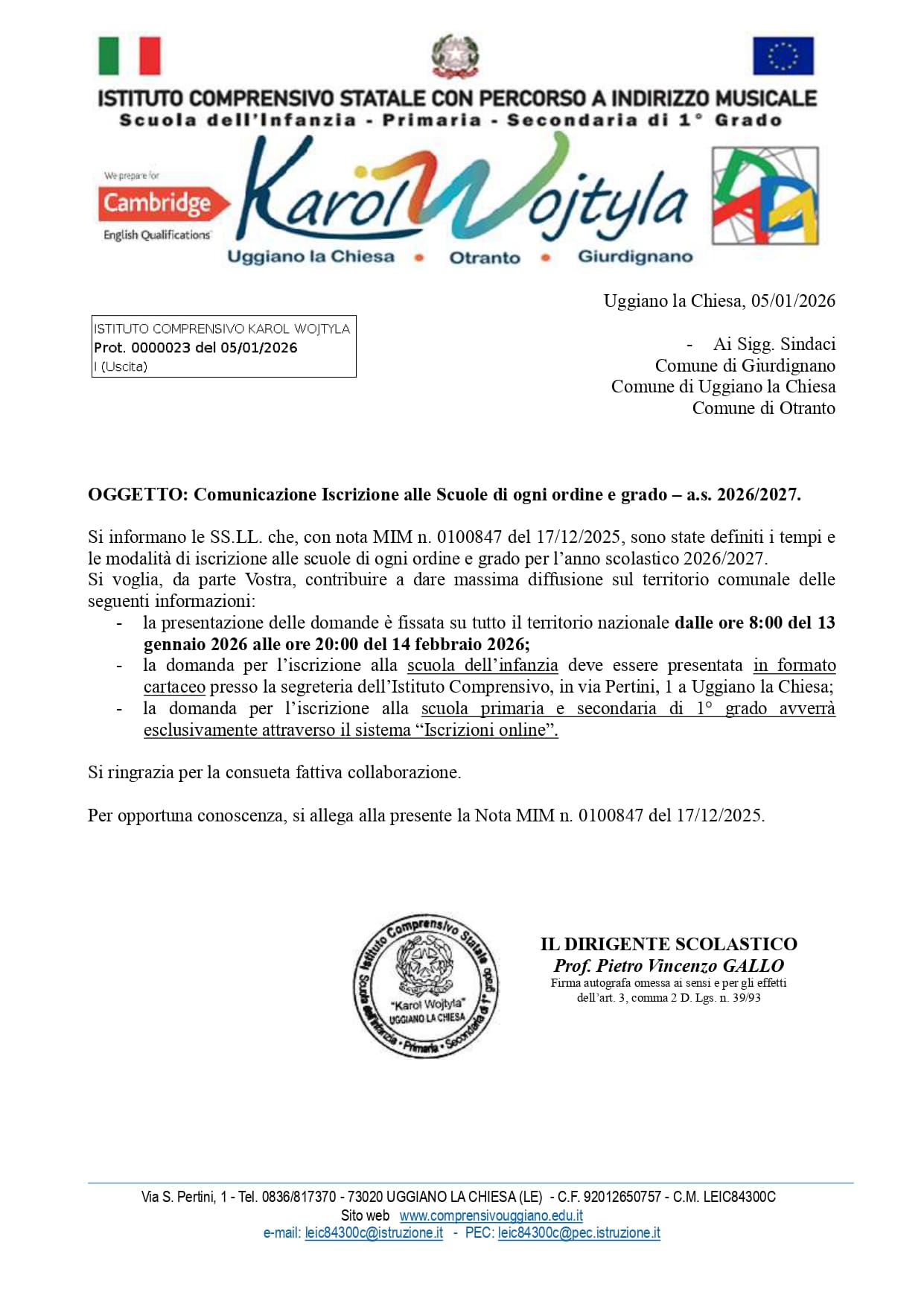 cartaceo presso la segreteria dell’Istituto Comprensivo, in via Pertini, 1 a Uggiano la Chiesa;