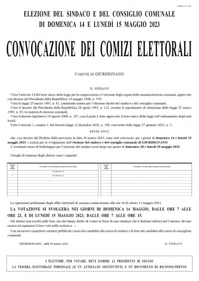 Convocazione dei comizi elettorali - elezione del Sindaco e del Consiglio Comunale di Domenica 14 e Lunedì 15 Maggio 2023.