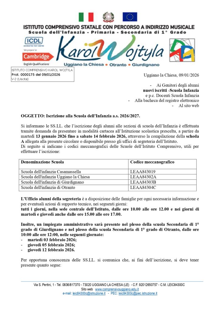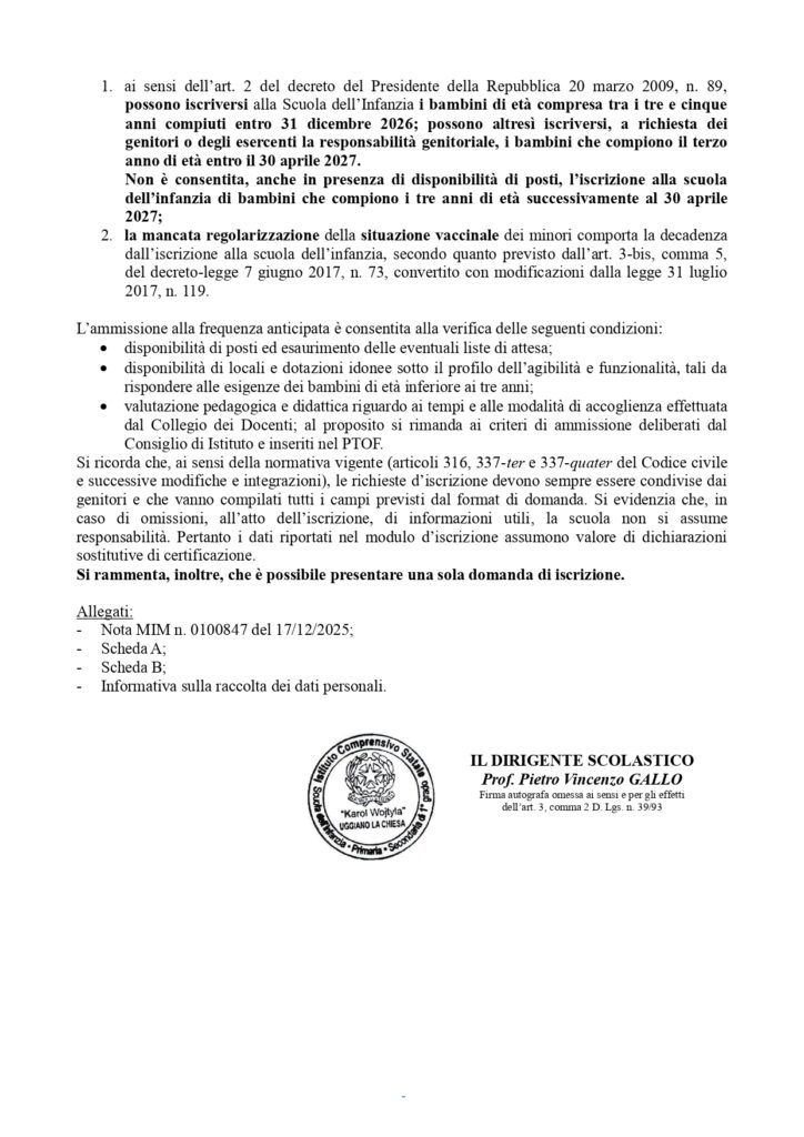 Si informano le SS.LL. che l’iscrizione degli alunni alle sezioni di scuola dell’Infanzia è effettuata tramite domanda da presentare in modalità cartacea all’Istituzione scolastica prescelta, a partire da martedì 13 gennaio 2026 fino a sabato 14 febbraio 2026, attraverso la compilazione della scheda